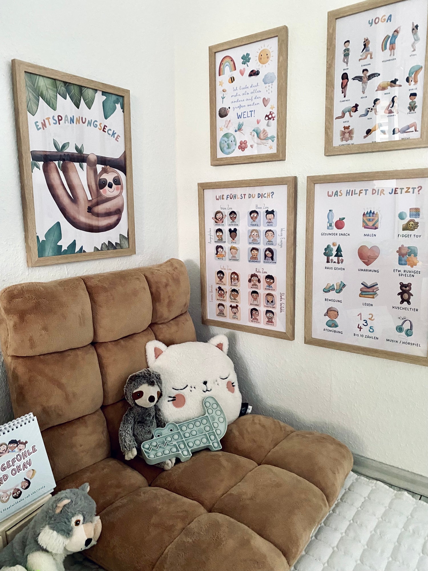Eine Entspannungsecke ist ein sicherer Ort, an den sich dein Kind zurückziehen kann, wenn es überreizt ist oder von großen Gefühlen überrollt wird. Hier dürfen alle Gefühle sein und dein Kind kann zwischen verschiedenen Entspannungsstrategien auswählen, um wieder zur Ruhe zu kommen.