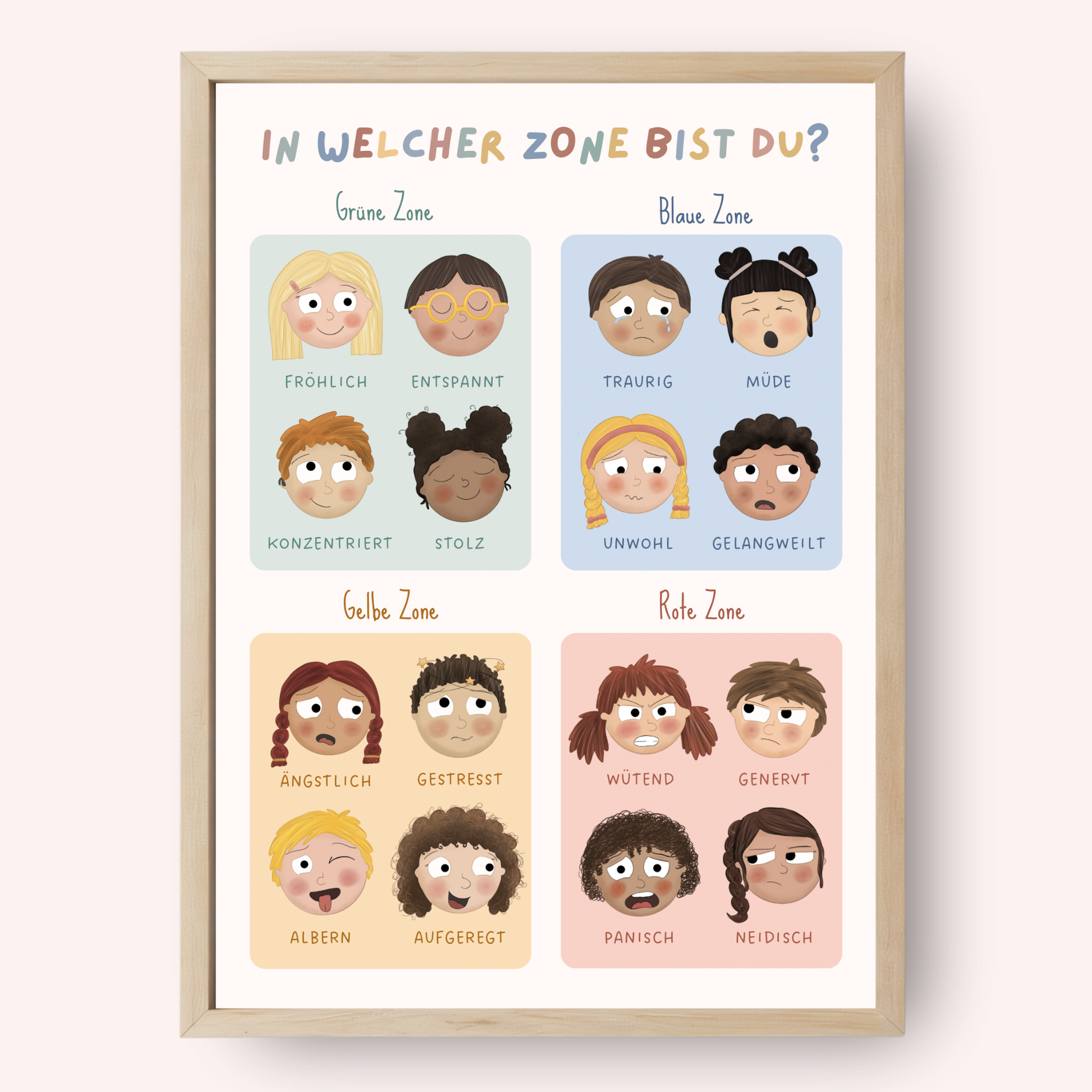 Mithilfe dieses Posters können Kinder die verschiedenen Gefühle kennenlernen und zeigen, wie sie sich fühlen. Gerade für jüngere Kinder ist es oft einfacher, eine Gefühlszone, wie Blau oder Rot zu benennen, als das bestimmte Gefühl.
