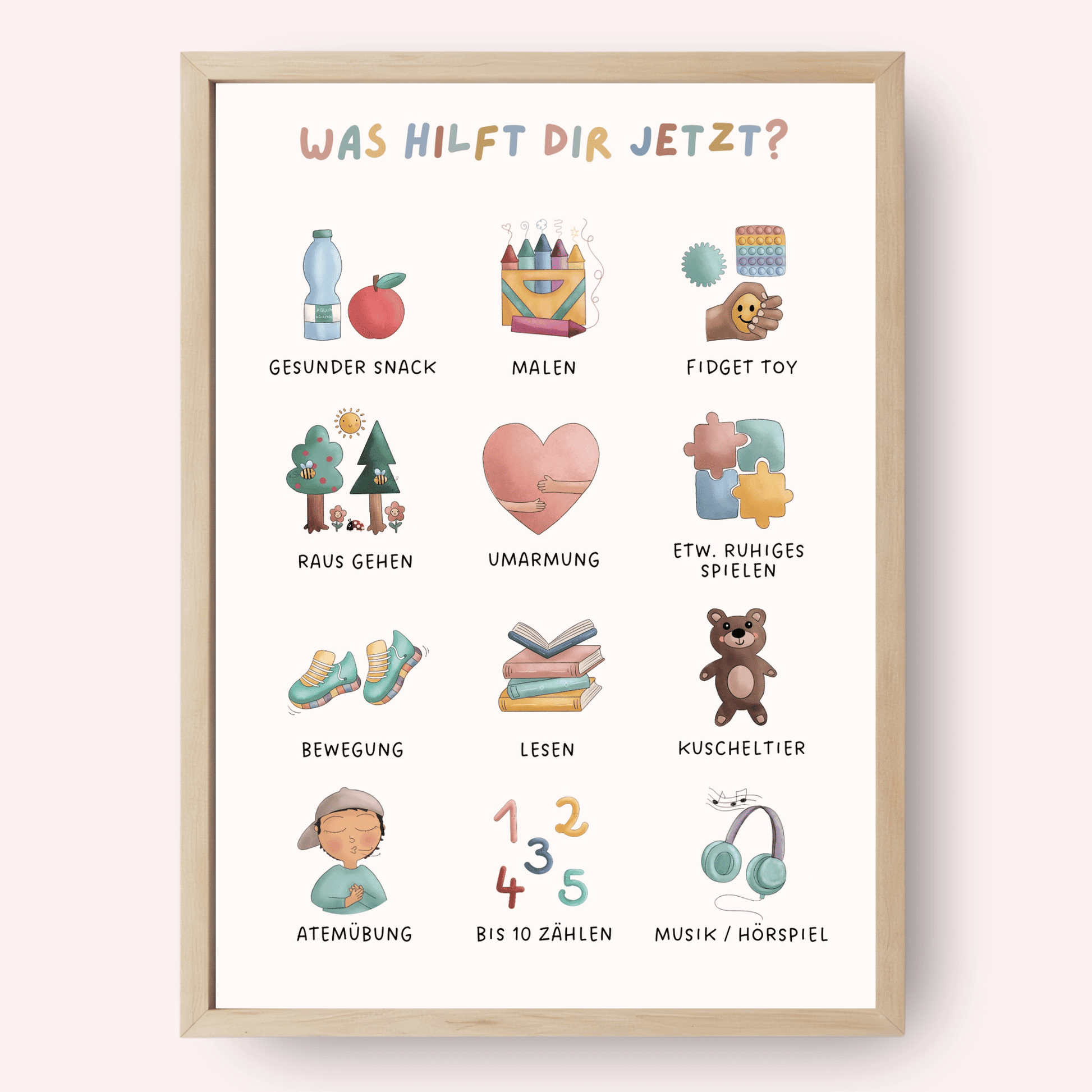 Auf dem Poster sind insgesamt 12 verschiedene Entspannungsstrategien abgebildet, die deinem Kind dabei helfen können, sich zu beruhigen und wieder ins innere Gleichgewicht zu finden.