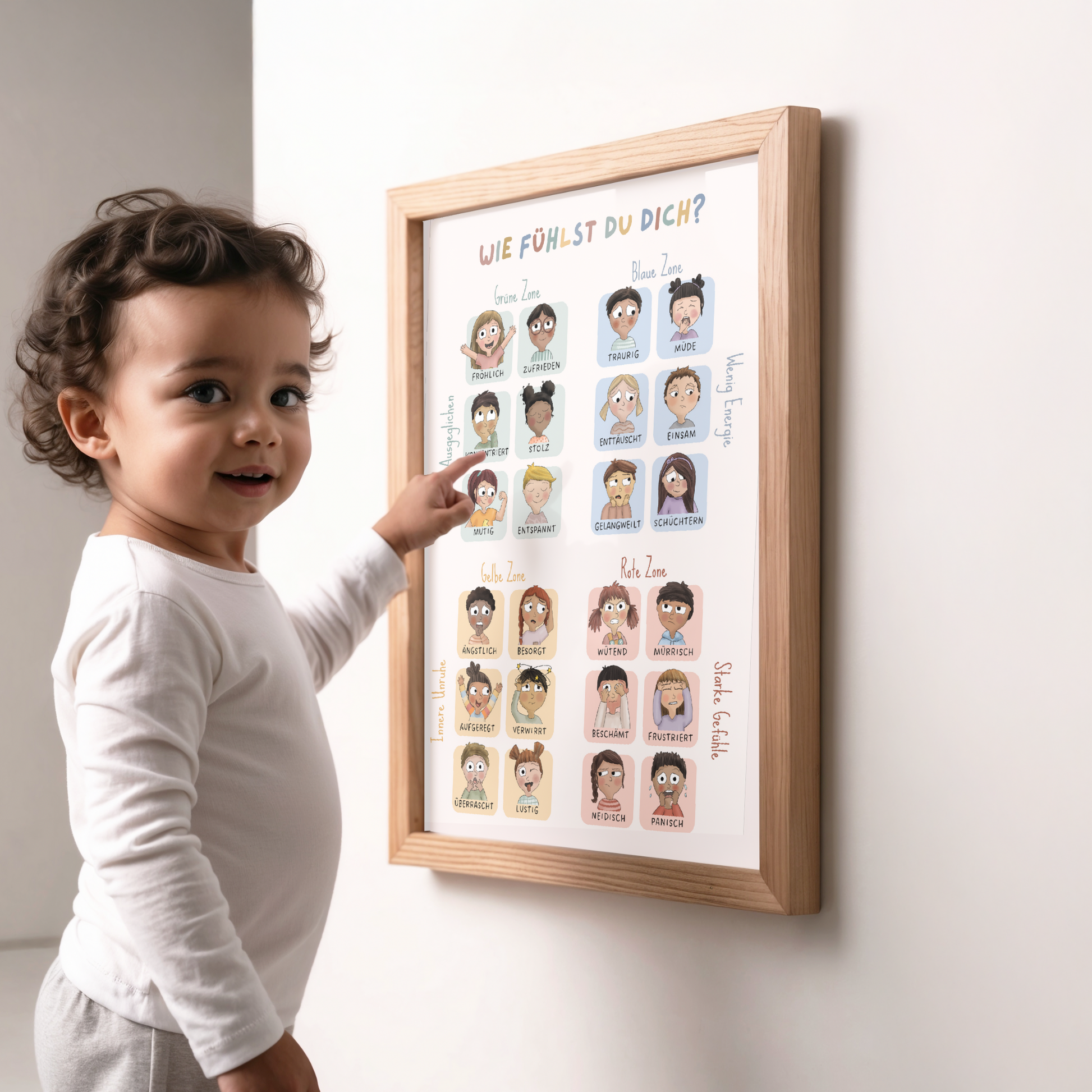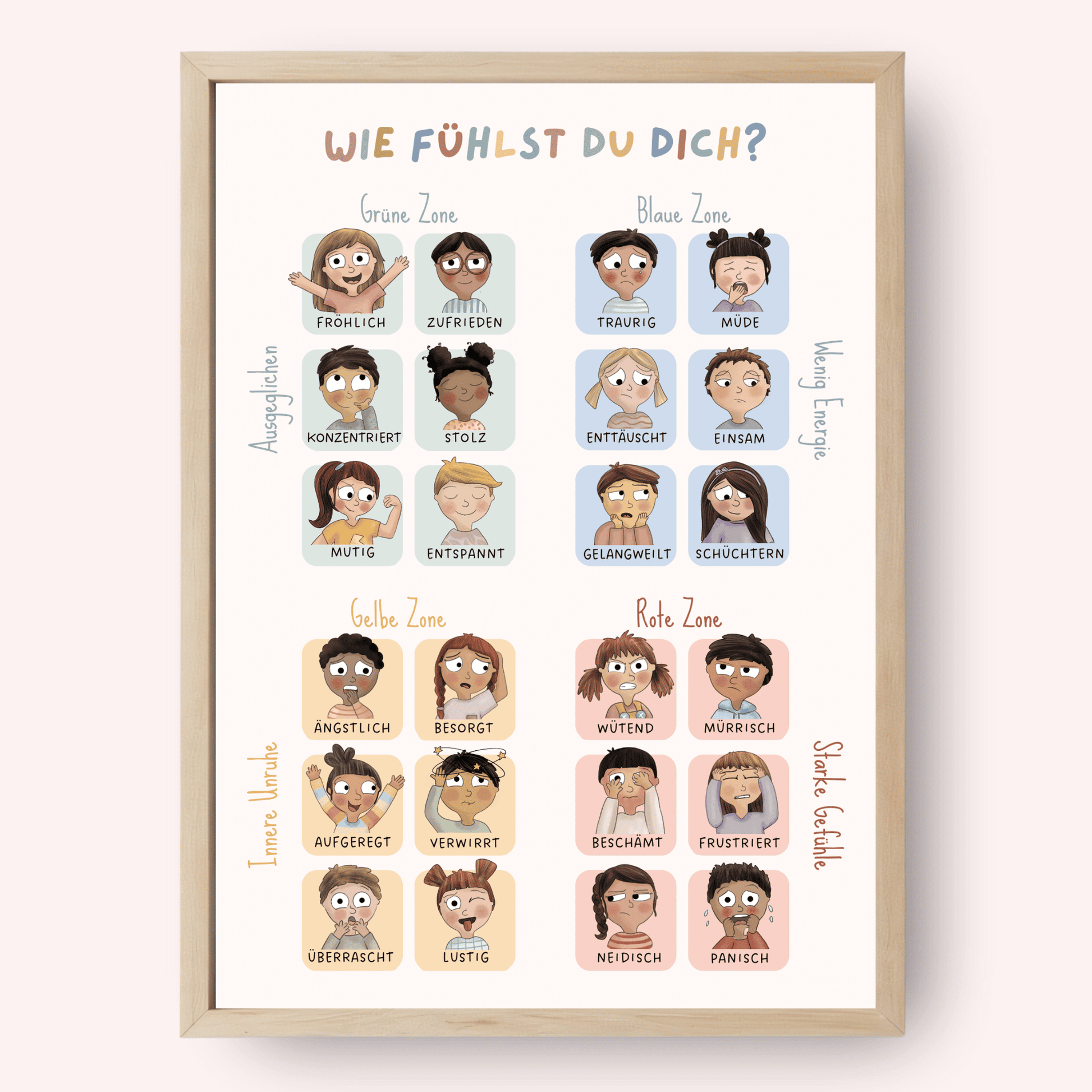 Mithilfe dieses Posters können Kinder die verschiedenen Gefühle kennenlernen und zeigen, wie sie sich fühlen. Gerade für jüngere Kinder ist es oft einfacher, eine Gefühlszone, wie Blau oder Rot zu benennen, als das bestimmte Gefühl.