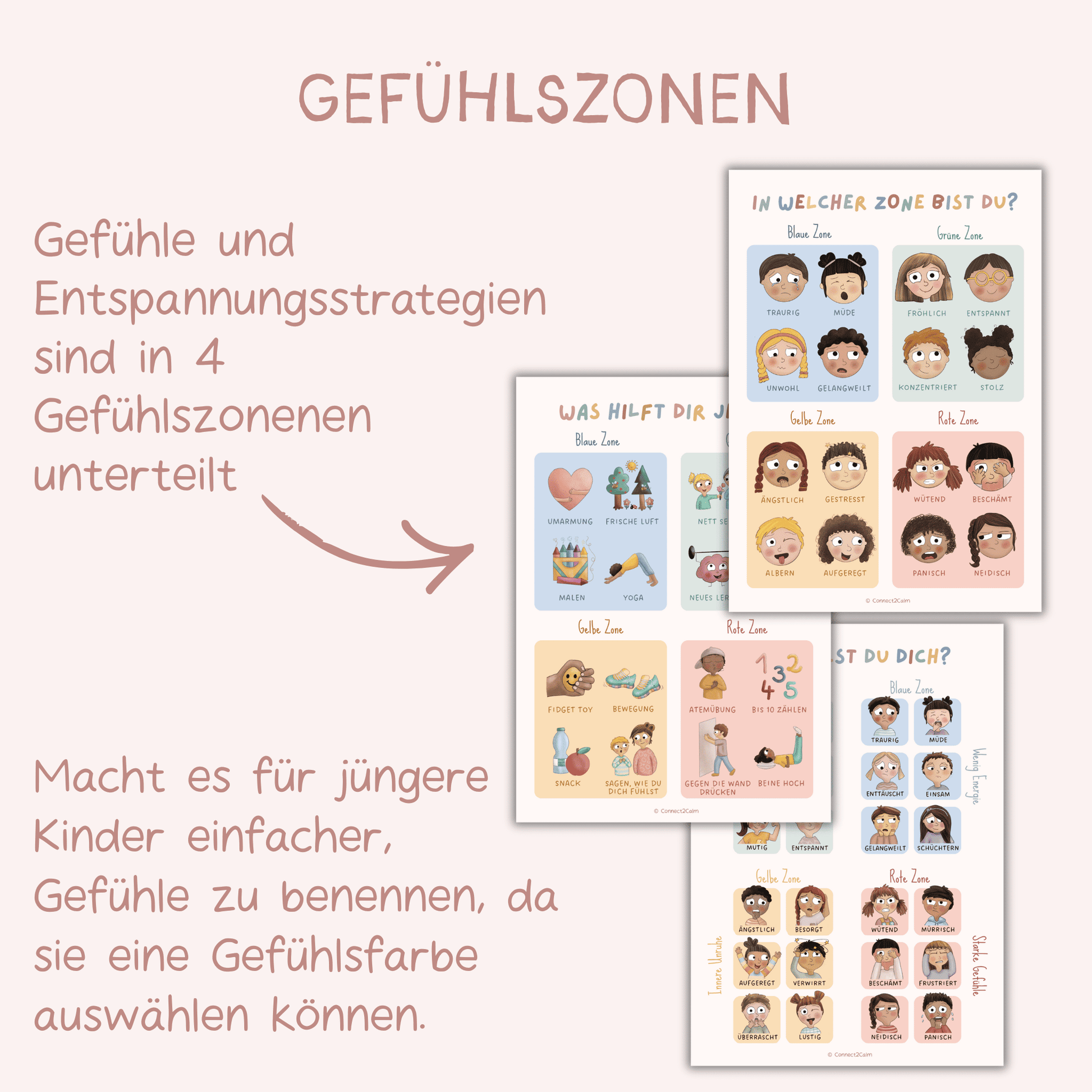 - Alltagsnah und vielseitig: Geeignet für verschiedene Altersstufen und Entwicklungsphasen. So sind z.B. Poster mit 4 verschiedenen Gefühlszonen (Blau, Grün, Gelb, Rot) enthalten, die es Kindern erleichtern, zu benennen, wie sie sich fühlen, da sie statt eines spezifischen Gefühls eine Gefühlsfarbe nennen können.