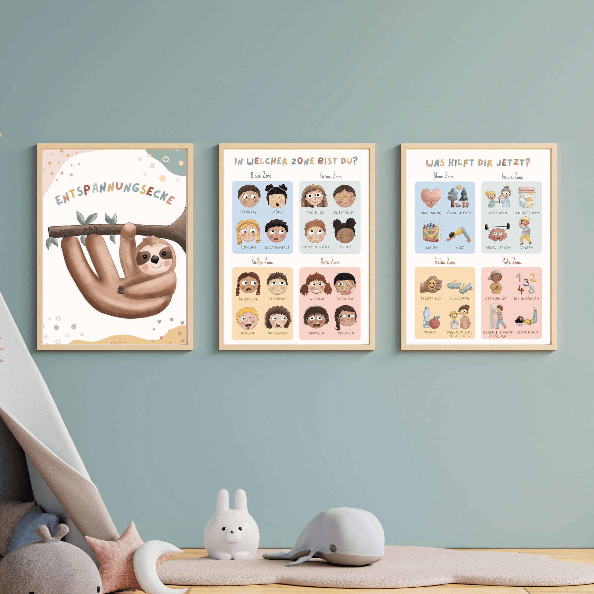 So kannst du ganz flexibel je nach Vorlieben und Entwicklungsstand deines Kinder dein eigenes Posterset für eure Entspannungsecke zusammenstellen.